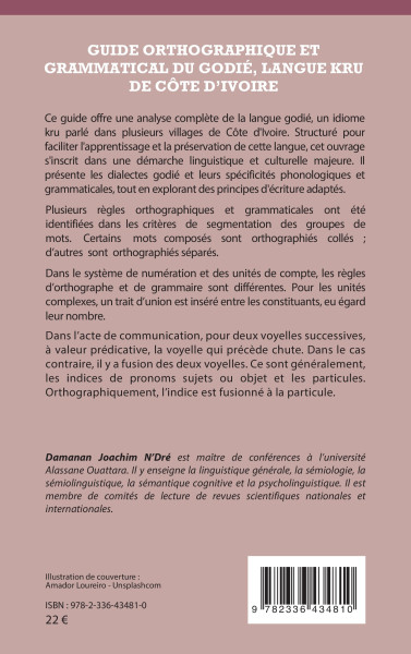 Ce guide offre une analyse complète de la langue godié, un idiome kru parlé dans plusieurs villages de Côte d'Ivoire. Structuré pour faciliter l'apprentissage et la préservation de cette langue, cet ouvrage s'inscrit dans une démarche linguistique et culturelle majeure. Il présente les dialectes godié et leurs spécificités phonologiques et grammaticales, tout en explorant des principes d'écriture adaptés.
